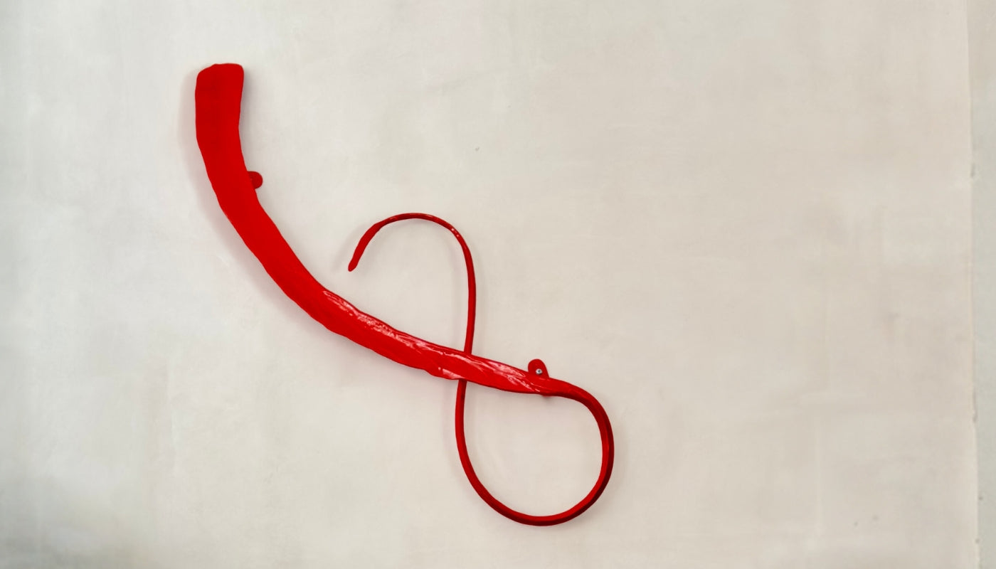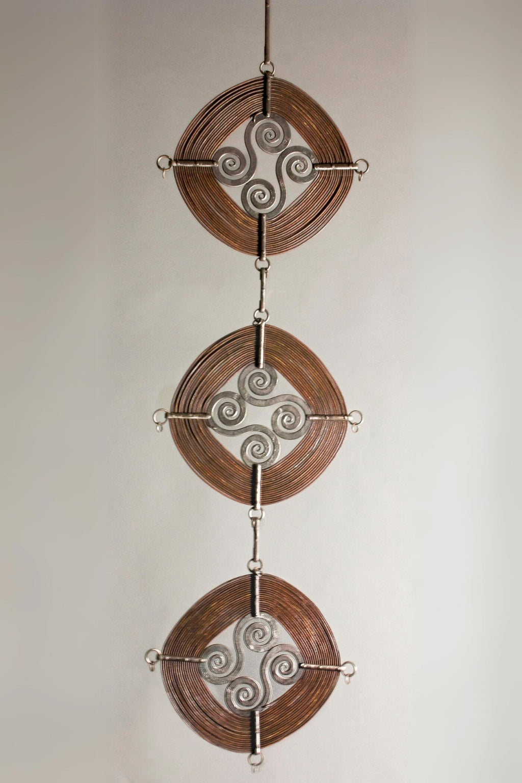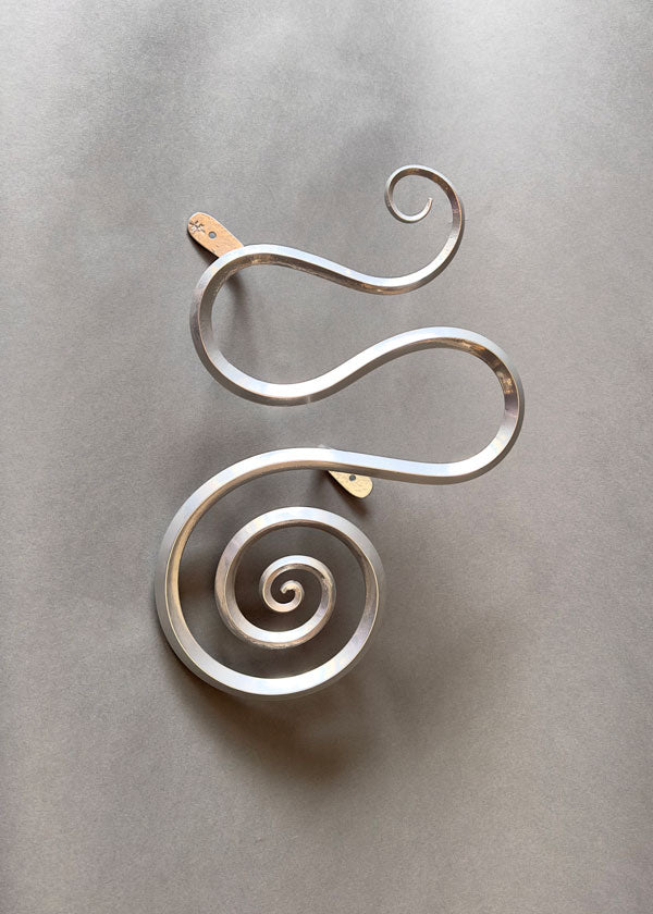 Windings wall sculptures combine approximately 60 feet of century-old wrought iron telegraph wire from the Atchison Topeka and Santa Fe Railway with two hand-forged "S" scrolls. Each scroll is crafted from round stock and flattened, creating a meditative design suitable for indoor or outdoor display.