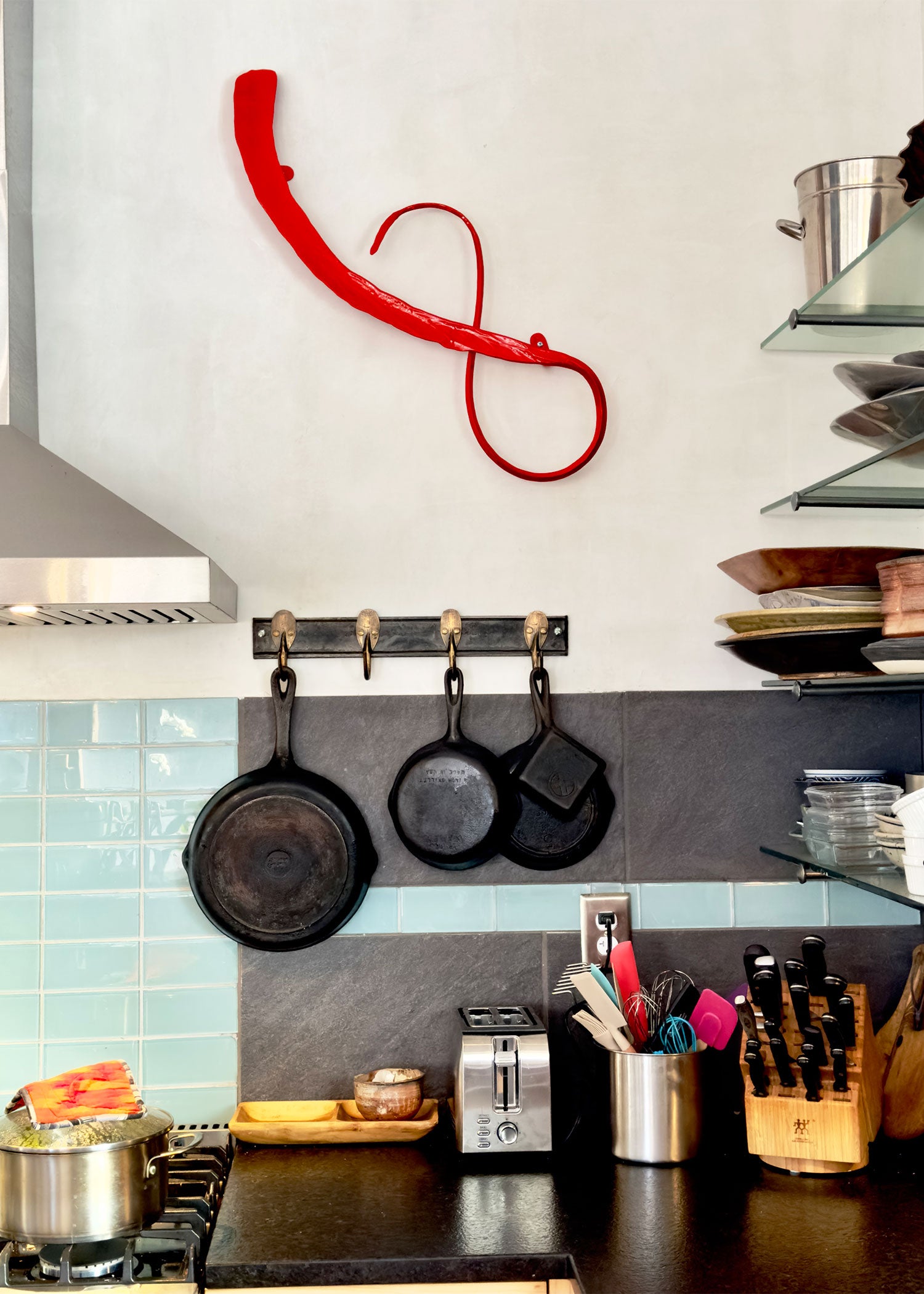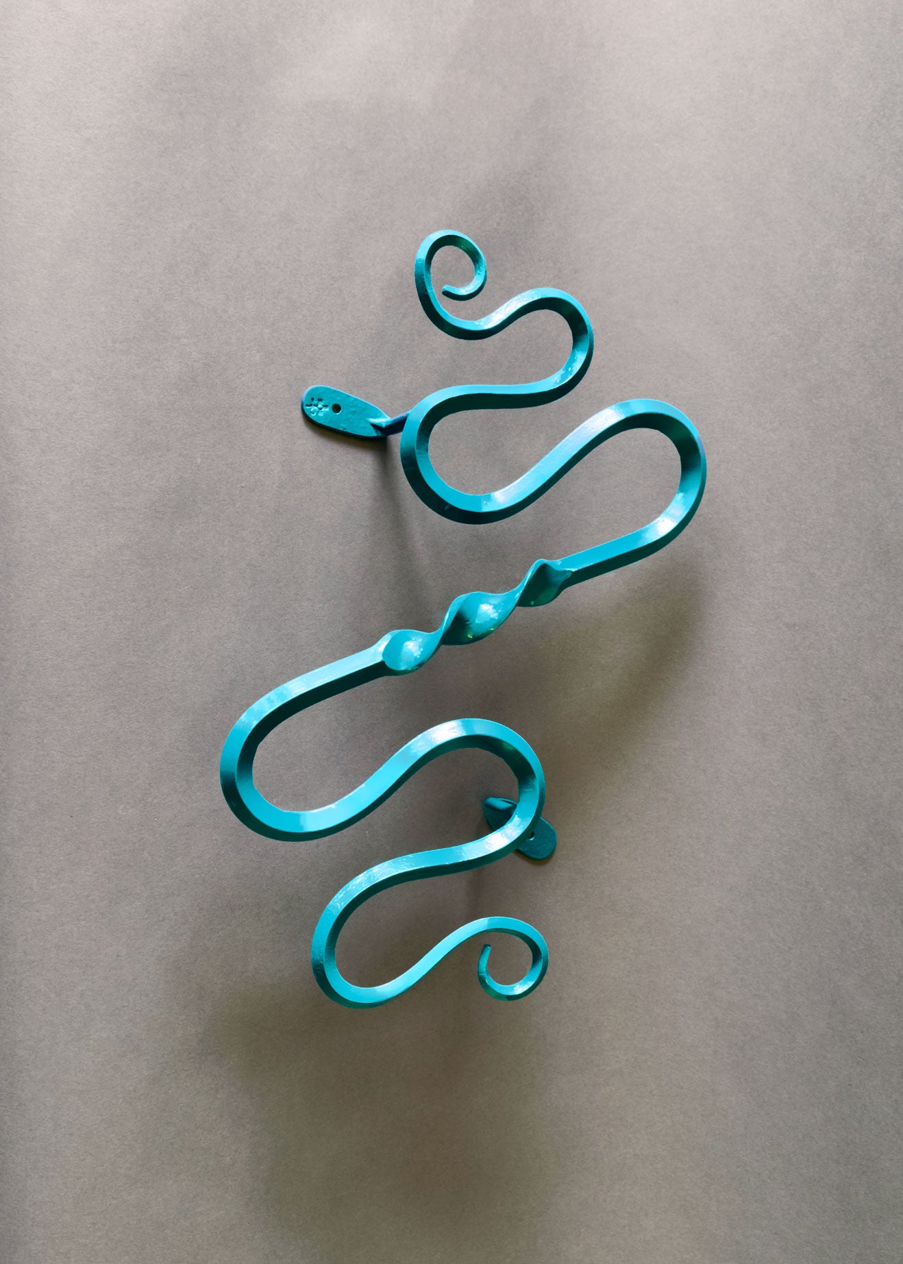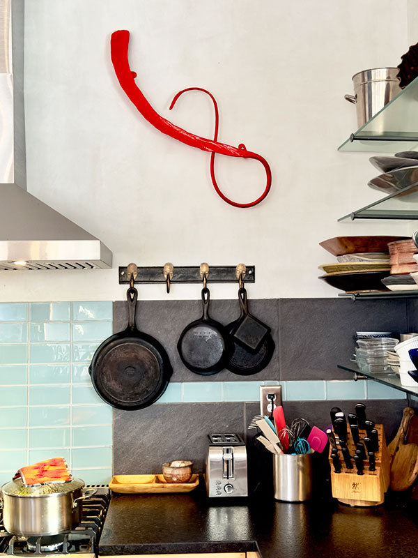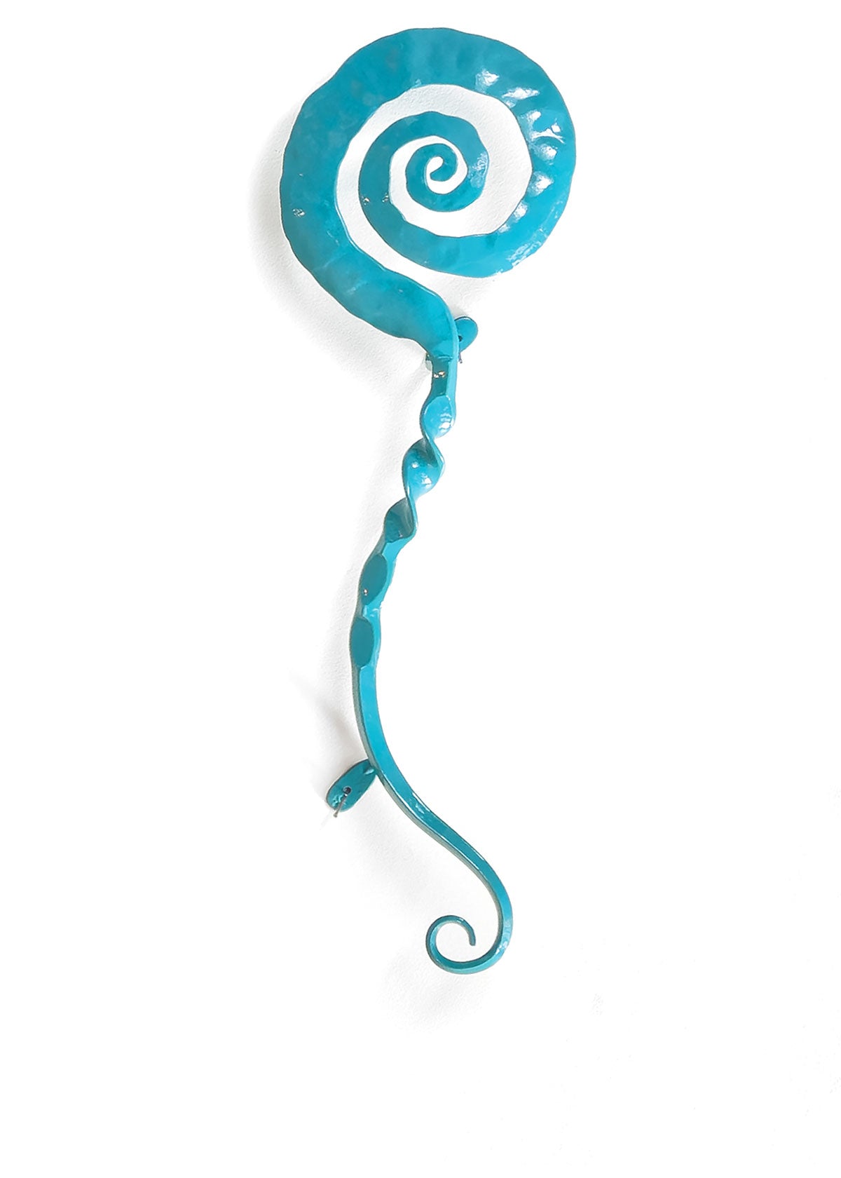 These decorative wall sculptures are hand forged on the anvil with an improvised approach resulting in contemporary sculpture. Intuition leads the design direction while a section of solid heated steel is orange hot for only a few minutes.